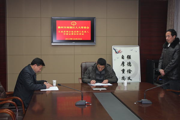 12月23日区五届人大常委会对届中调整的部分区人民政府组成部门拟任主要负责人,进行了任前法律知识考试。自2003年以来,区人大常委会就建立了拟任领导干部任职前法律知识考试的长效机制,把好任前“法律考试关”。凡任前法律知识考试没有通过的干部,区人大常委会不予任命。本次考试由区人大人选工委结合实际统一命题、统一考试、统一阅卷,考试内容主要涉及《中华人民共和国宪法》、《行政处罚法》、《行政许可法》、《国家赔偿法》、《监督法》等法律知识。
