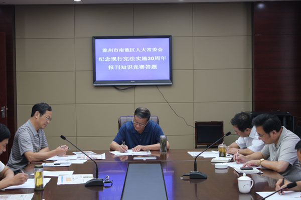 9月24日上午,滁州市南谯区人大常委会主任会议室济济一堂,区人大机关全体工作人员正聚精会神参加由省委宣传部、省人大办公厅、省司法厅、省依法治理领导小组办公室共同举办的全省宪法知识竞赛答题;区人大常委会四位副主任林永海、盛恩松、李永葆、王良琪参加了答题活动。答题结束后区人大常务副主任林永海进行了讲话,他指出,组织学习宣传宪法,普及法律知识,进一步提高全社会特别是国家机关工作人员的宪法意识和人大意识,是各级人大常委会应有的职责。今年是现行宪法实施30周年,区人大常委会要根据上级人大的要求,认真扎实的开展好纪念系列活动,当前重点是要组织好宪法知识报刊竞赛答题和全市宪法电视知识竞赛参赛准备工作。